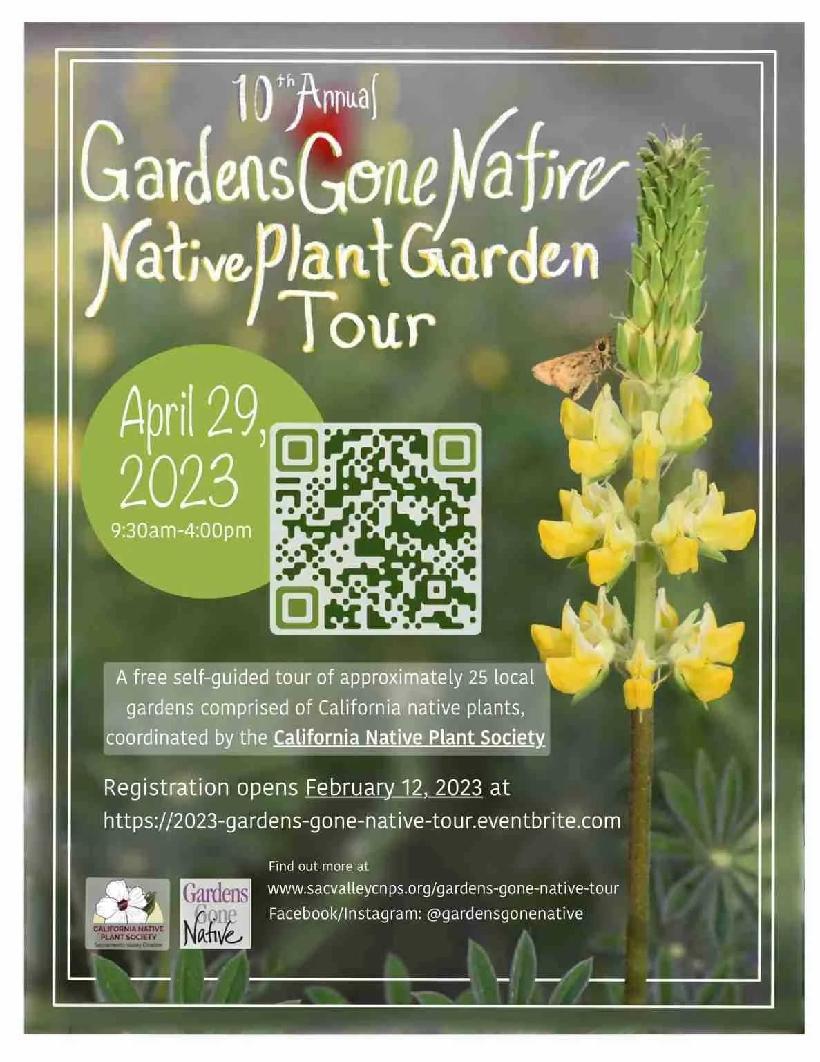 The 10th Annual Gardens Gone Native plant tour features 25 California gardens in the Sacramento and Yolo county areas will be held on April 29, 9:30-4pm. Gardens are overall focused on California native plants and exemplify urban native plant landscaping. Professionally landscaped gardens, homeowner designs, as well as a school demo garden will be featured. Attendees can speak with garden hosts about their landscape design choices and challenges. Free registration will begin February 12 through eventbrite. Once registered the week before the tour tour day a map and garden description brochure will be emailed to all registrants. Hope to see you at this years spring tour!