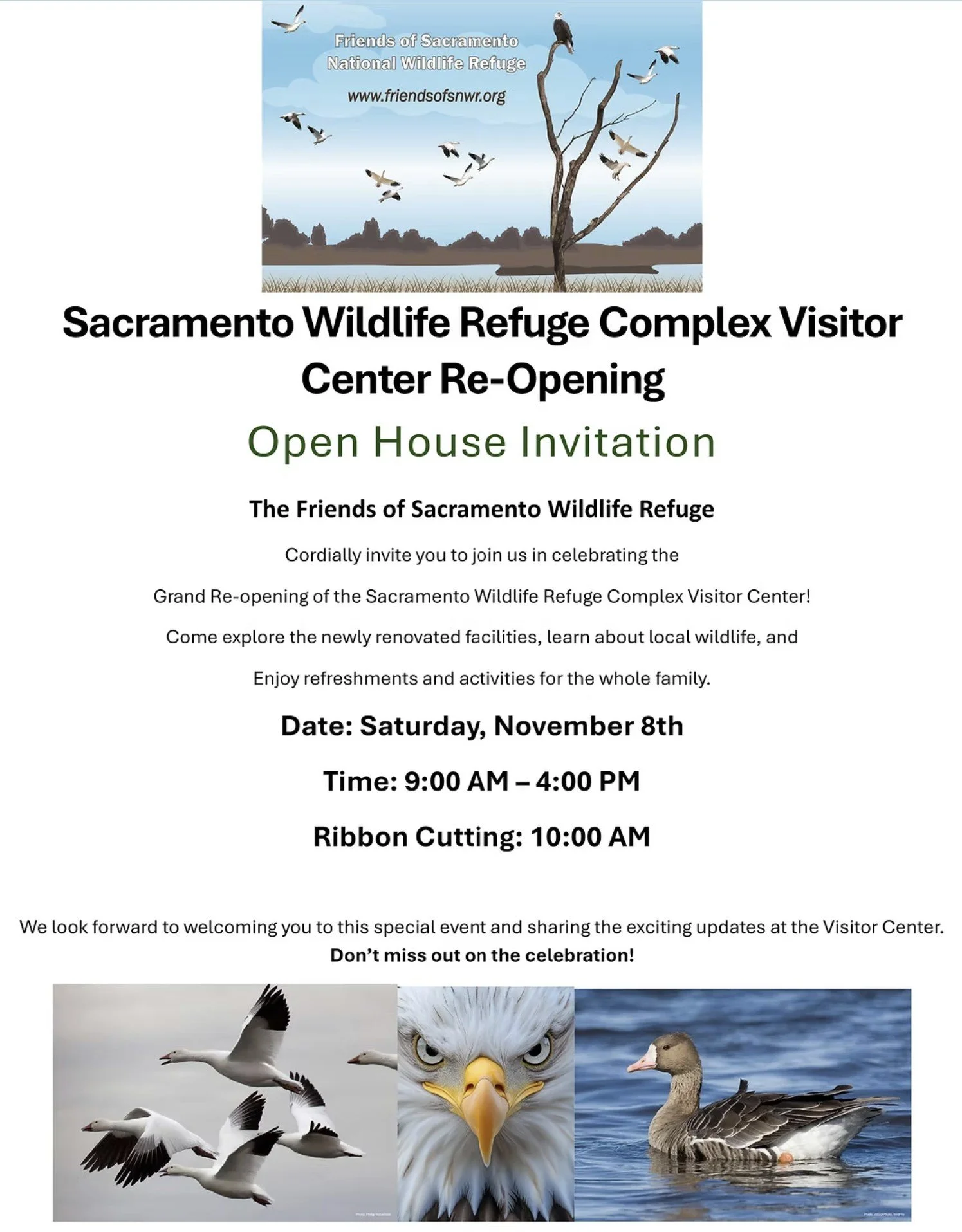 Cordially invite you to join in celebrating the Grand Re-opening of the Sacramento Wildlife Refuge Complex Visitor Center! Come explore the newly renovated facilities, learn about local wildlife, and Enjoy refreshments and activities for the whole family.