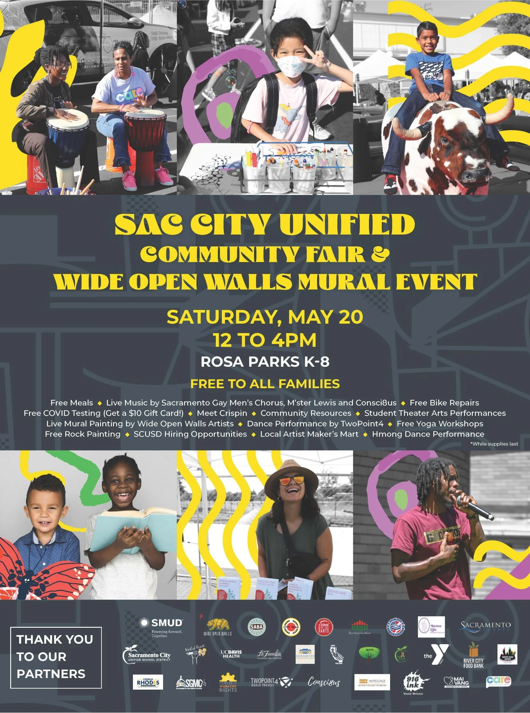Join Sac City Unified and Wide Open Walls this Saturday, May 20 from 12-4pm at Rosa Parks K-8 to see 45 Wide Open Walls artists transform the campus! While you walk around and discover all the new murals in progress, families can also enjoy: